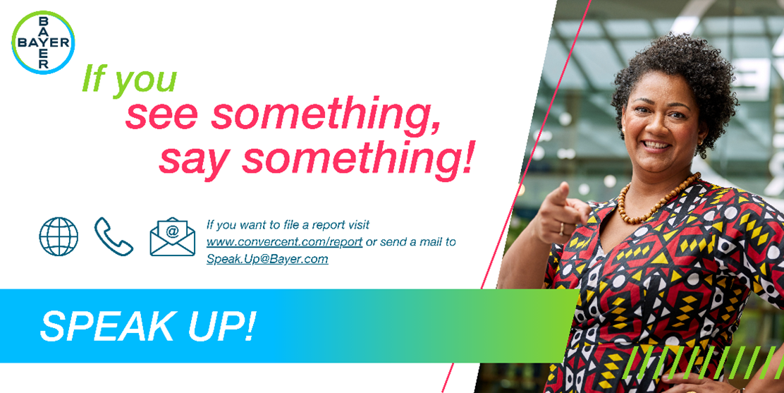 Wenn Sie der Meinung sind, dass eine Tätigkeit oder ein Verhalten einen wesentlichen Compliance-Verstoß darstellen könnte, können Sie sich in vielen Sprachen an unseren globalen Speak Up Kanal wenden. Dies ist ein sicherer Kanal, über den jeder, einschließlich der Öffentlichkeit, vertraulich (und anonym, soweit dies nach lokalem Recht zulässig ist) mutmaßliche Compliance-Verstöße melden kann. Über Speak.Up@Bayer.com können Sie sich auch direkt an die Compliance-Abteilung von Bayer wenden.