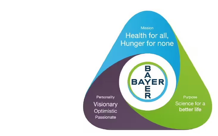 Das Bayer-Kreuz steht für Wissenschaft, Leistung und Zuverlässigkeit, visualisiert durch die blaue Seite, und Innovation, Nachhaltigkeit und Lebensorientierung, symbolisiert durch die grüne Seite. Der Kreis steht für Ganzheitlichkeit, Schutz und Engagement.
